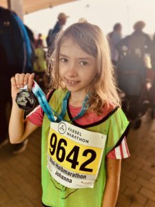 Wir sind um 15.45 Uhr in der Damaschkestraße losgelaufen. Das Ziel war im Auestadion. Wer ins Ziel gekommen ist, hat eine Medaille bekommen. Jedes Jahr ist auf dieser ein Märchen abgebildet. In diesem Jahr war es „der Froschkönig“.